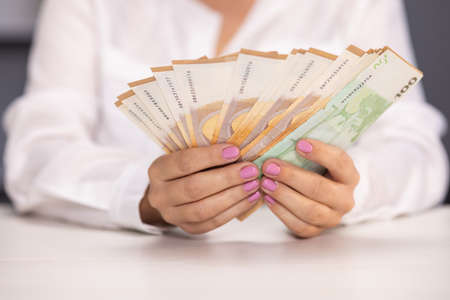 Close up on hands of unknown caucasian woman holding and counting a pile of money EURO EUR banknotes counting salary receiving raise or preparing to pay bills