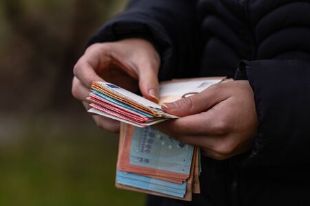 Persons hand counting cash money paper currency payment. Financial operations with cash money, easy and dirty money. Financial Crisis Eu Bill. Concept - Finance Business Investment Success