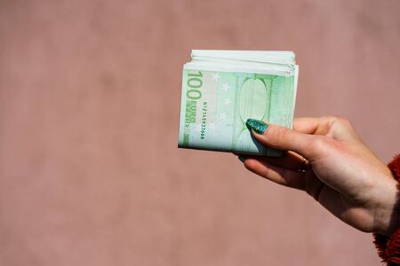 Hand holding and showing euro money or giving money. World money concept, 100 EURO banknotes EUR currency isolated. Concept of rich business people, saving or spending money.
