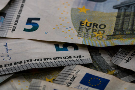 5 EURO banknotes. EUR money background representing savings, income, or investment