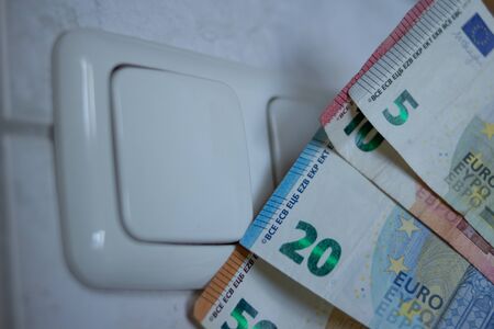 Euro banknotes and on Electric light switch. Expensive green energy concept. Close up light swith