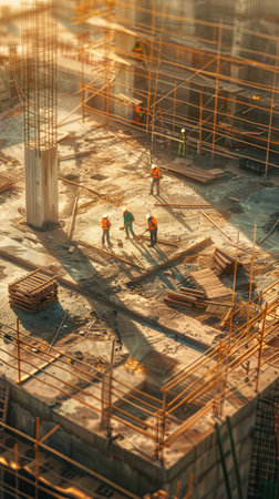 A team of construction workers, clad in hard hats and high visibility vests, working together to lay the foundation of a modern skyscraper Photography Overcast weather Depth of field bokeh effect