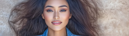 A woman with long voluminous hair smiles confidently at the camera. She wears a denim jacket showcasing natural beauty and a relaxed demeanor. Soft lighting enhances her features.