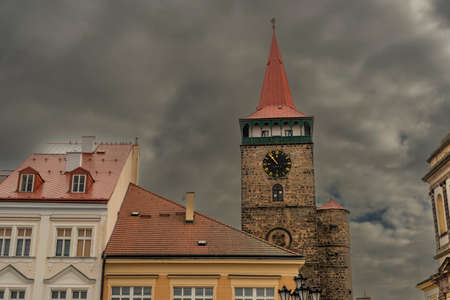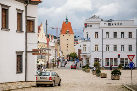 Pelhrimov, Czech Republic, 03 July 2021: Lower or Jihlavska gate, Medieval renaissance clock tower, narrow picturesque street with colorful baroque and gothic houses at summer day in center of town.