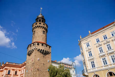 Goerlitz, Saxony, Germany, 04 September 2021: gothic renaissance massive Reichenbach Tower or Reichenbacher Turm, historical center of old town, part of medieval fortification at sunny summer day.