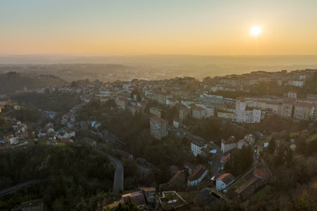 Aerial view of dense historic center of Thiers town in Puy-de-Dome department, Auvergne-Rhone-Alpes region in France. Rooftops of old buildings and narrow streets at sunset