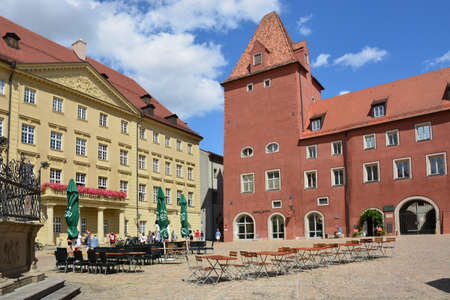 BAUTZEN, GERMANY - AUGUST 23: Tourists at the town hall of Bautzen, Germany on August 23. Bautzen is a hill-top town in eastern Saxony. Foto taken from Hauptmarkt with view to the town hall.