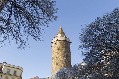 Jicin town after winter storm with color old buildings