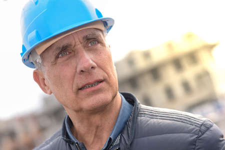 Confident businessman and engineer posing with a safety helmet, he is looking away and thinking