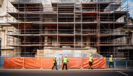 Young female cement worker leads her team at a lively construction site during daylight hours