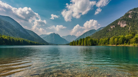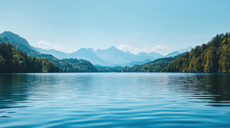 A lake surrounded by mountains with a blue sky, AI