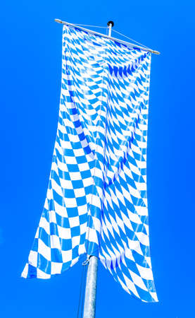 Oktoberfest, Munich. Germany. Bavarian blue white flag waving on cloudy sky background