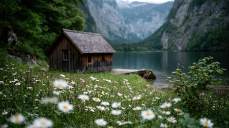 A rustic wooden cabin sits by a serene lake surrounded by lush greenery and towering mountains. The image displays a soft, blurred effect, with bright wildflowers in the foreground. This tranquil environment suggests a sense of peace and could be suitable for various commercial or editorial applications.