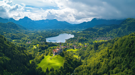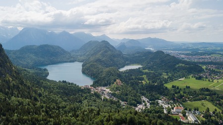 Aerial view on Alpsee lake and Hohenschwangau Castle, Bavaria, Germany. Concept of traveling and hiking in German Alps