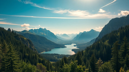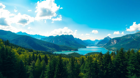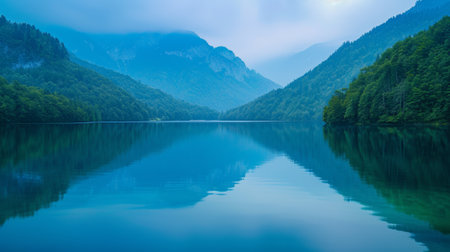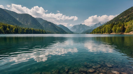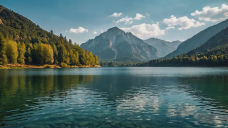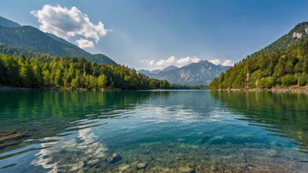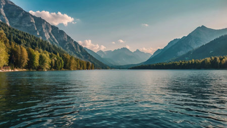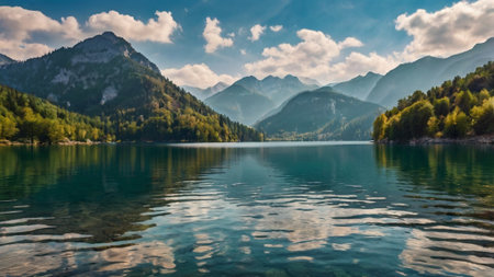 A tranquil lake scene surrounded by majestic mountains and lush greenery, perfect for nature lovers and travel enthusiasts seeking peaceful landscapes.