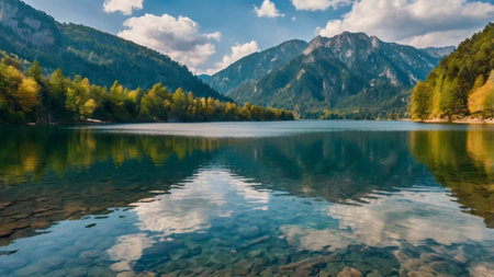 panoramic view of beautiful alpine lake with reflection in water