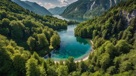Aerial view of beautiful alpine lake with turquoise water and forest