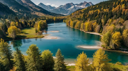 a pic from the alps with mountains rivers trees as landscape