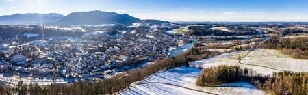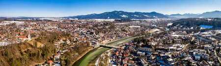 aerial famous old town of bad toelz february snow. Mountains Isar river alps bavaria germany