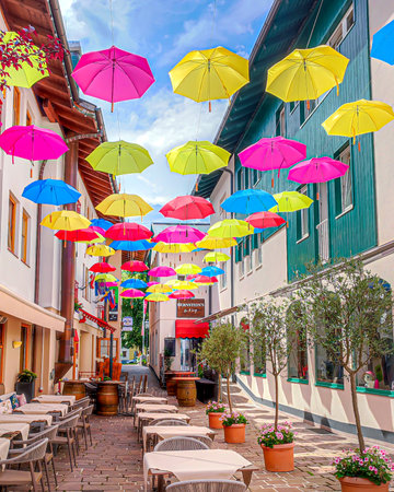 Old street in the historic center on a sunny morning, Fussen, Bavaria, Germany