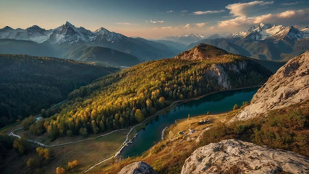 Panoramic view of mountain lake in autumn. Caucasus Mountains, Russia