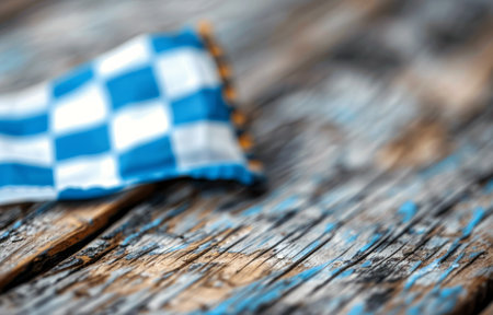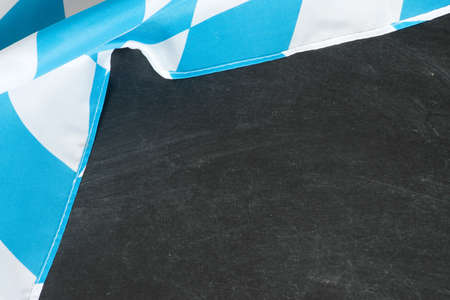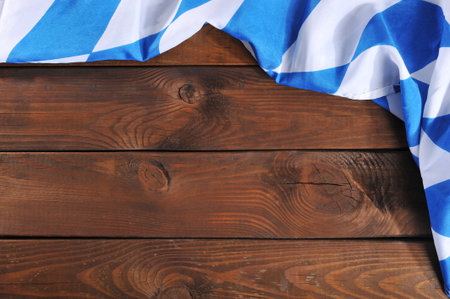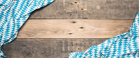 Oktoberfest in Germany Original Bavarian flag on old weathered wooden board. Background with copyspace.
