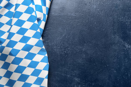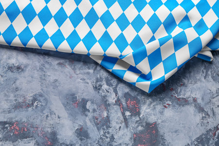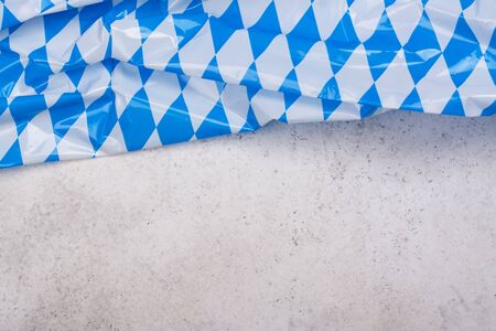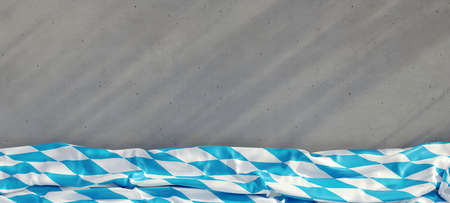 Oktoberfest background. Bavarian rhombic pattern blue and white color flag on grey, banner. 3d render