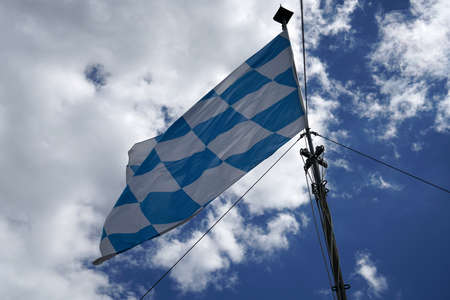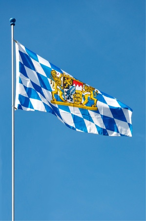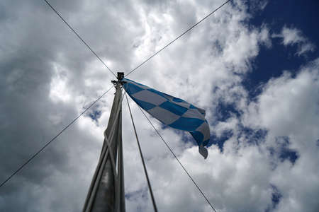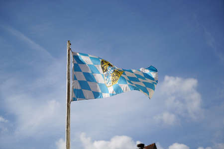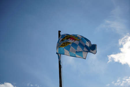 Bavarian flag flies against a blue white sky on a summer day in Bavaria