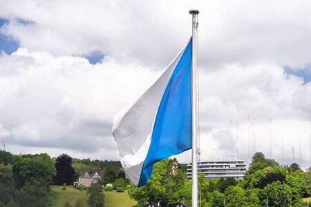 The Bavarian flag flies in an allotment garden in Frankfurt, Hesse, Germany.
