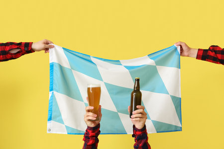 Oktoberfest, Munich. Germany. Bavarian blue white flag waving on cloudy sky background