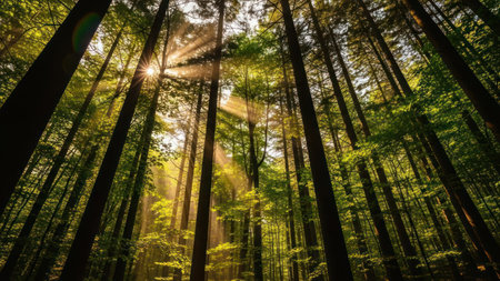 A dense forest scene shows sunlight penetrating through towering trees. The composition highlights vertical lines and natural textures. The color palette features shades of green, brown, and golden sunlight, creating a visually appealing landscape. This image could be used for various projects related to nature, environment, or design.