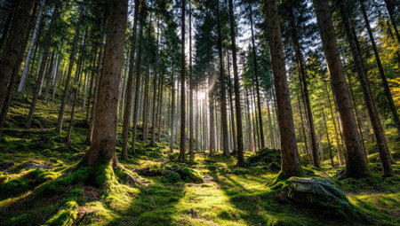 A tranquil forest landscape captures the beauty of tall trees with sunlight filtering through the branches, highlighting the lush green moss covering the forest floor.