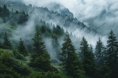 This atmospheric image depicts a misty forest with evergreen trees shrouded in fog, creating a tranquil and serene environment that showcases nature's untamed beauty.