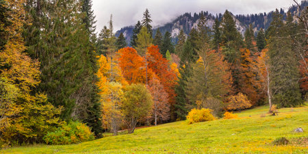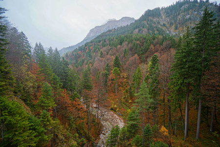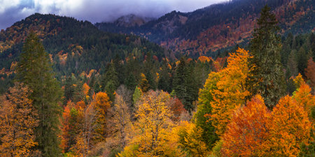 Autumn Mixed Forest View at Bavarian Alps, Oberammergau, Bavaria, Germany, Europe