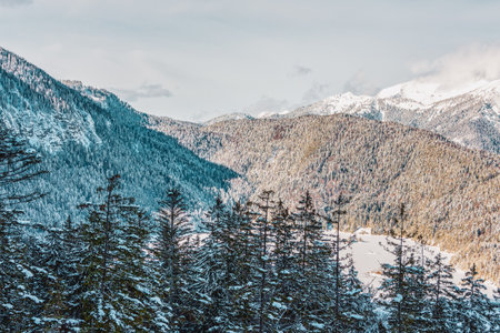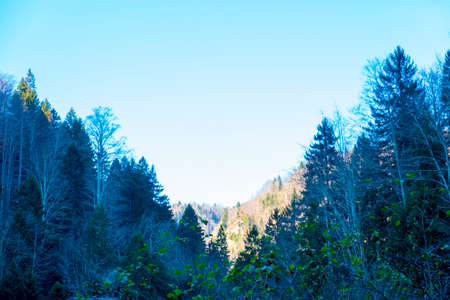 Beautiful landscape with coniferous forest in the mountains. Selective focus.