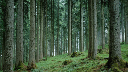 A captivating forest scene showcases tall trees standing proudly in a lush green setting, with soft sunlight streaming through the densely packed foliage, creating a peaceful atmosphere.