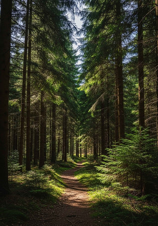 Impressive spruce trees in the forest, spirituality and wood therapy