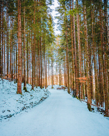 A vertical shot of a winter forest with a pathway surrounded by trees