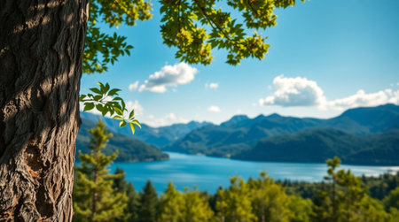 This breathtaking landscape features a serene lake surrounded by vibrant trees and majestic mountains, capturing nature's beauty at sunrise.