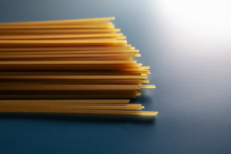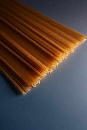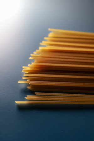 Uncooked Italian spaghetti pasta strands on a blue background, symbolizing traditional cuisine and healthy carbohydrate ingredient