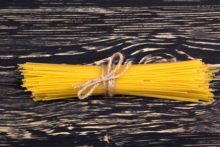 Dry pasta spaghetti, bandaged with ribbon, on black background with copy space