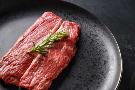 Raw marbled ribeye steak in black plate. Close up with copy space