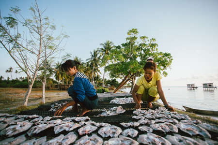 Semporna, Sabah, Malaysia - 26 April 2020 -Sea gypsies kids drying salted fish at Maiga Island