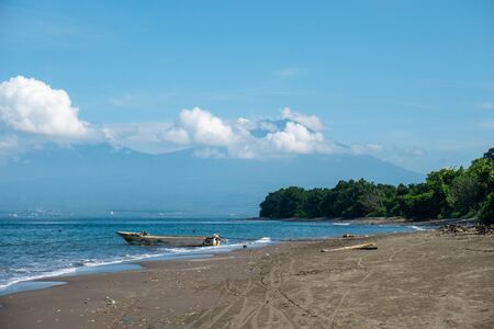 Balinese tropical beach with blue sky And palm trees. An old boat on the sand. Volcano with clouds in the foreground.