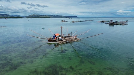 Aerial view of fishing boat and cages for fish and shrimp. Fish farming aquaculture, Philippines