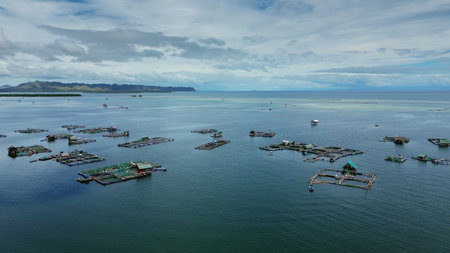 Aerial view of fish farm with cages for fish and shrimp. Fish farming aquaculture, Philippines