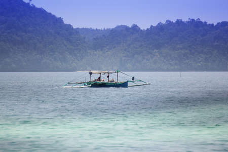 Morning on a tropical island during sunrise and boats on the sea surface. Sunrise over ocean. Balabac, Palawan, Philippines