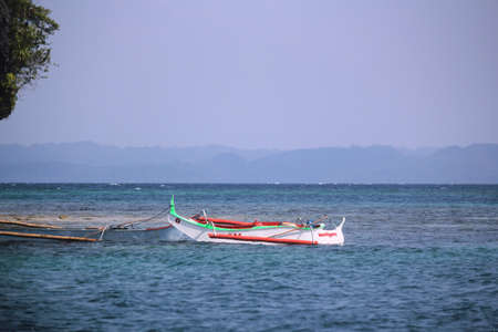 Surigao del Sur, Philippines- August 2014: Colorful outrigger boats in the water in Britania Islands, Surigao del Sur.