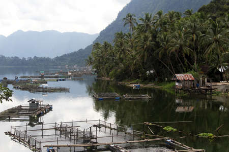 Fish embankment and wooden house on the lake Maninjau in Indonesia