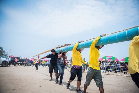 Nakhonsawan,Thailand -MAY 11,2019: Unidentified people prepare traditional rockets in Rocket festival 'Boon Bang Fai' The celebration for plentiful rains during the rice plant season